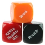 In the package, you’ll find 3 dies, one red, one black, and one orange. To play, take turns rolling all 3 together. When the dust settles, you’ll have yourselves an act (orange die), a body part (red die) and a sexy adverb (black die). Instant X-rated foreplay! You can remove any die you like to hold on to some control.